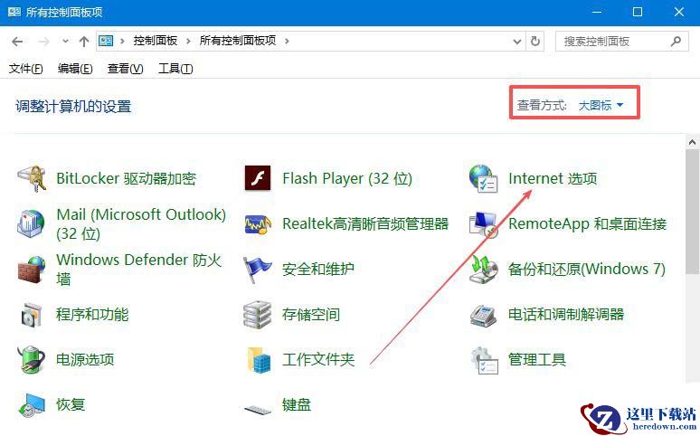 1、首先,打开Win10系统的控制面板界面,设置“查看方式”为“大图标”,再打开下方的“Internet选项”。
