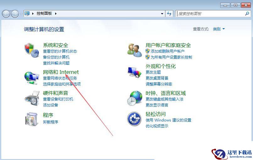 1、首先,打开Win7系统的控制面板界面,点击进入到“网络和Internet”设置。