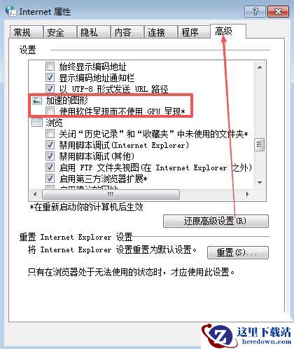 2、接着,在弹出的窗口中,切换到“高级”选项栏,取消勾选“使用软件呈现而不使用GPU呈现”选项,点击确定即可。