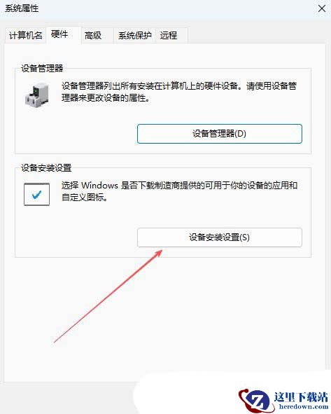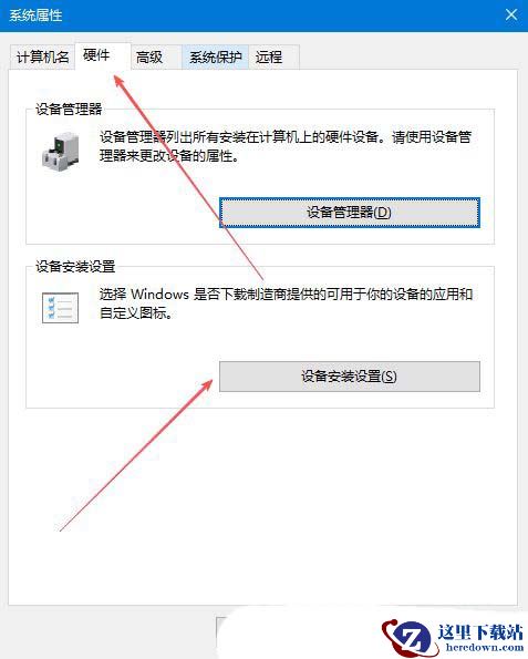 3、然后,在弹出的窗口中,切换到“硬件”选项栏,并选择打开“设备安装设置”。