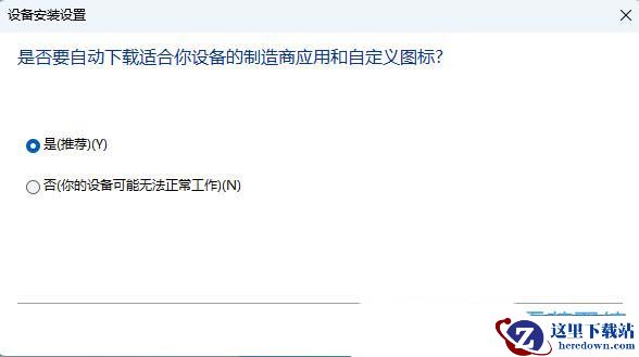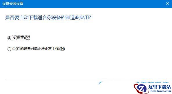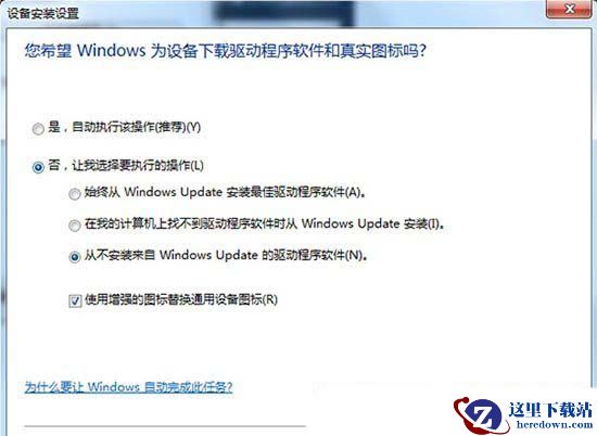 4、设备安装设置,您希望 Windows 为设备下载驱动程序软件和真实图标吗?将是,自动执行该操作改为否,让我选择要的操作,然后选择从不安装来自 Windows updata 的驱动程序软件,最后再点击确定即可;