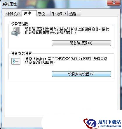 3、系统属性窗口,选择硬件选项卡,选择 Windows 是否下载设备的驱动程序软件及有关这些设备的详细信息,点击设备安装设置;
