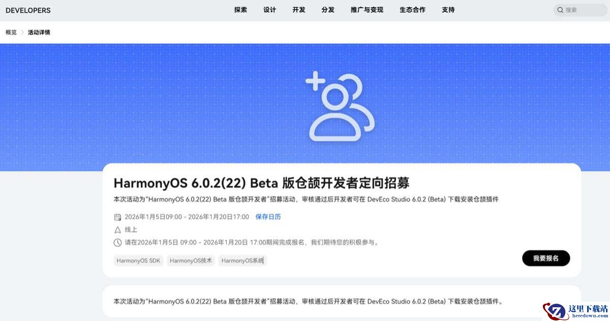 需要注意的是,本活动为 HarmonyOS 6.0.2 (22) Beta 仓颉版本发布前小范围定向招募活动,会在 2026 年 1 月 7 日起陆续进行活动审核并进行 HarmonyOS 6.0.2 (22) Beta 版本的仓颉插件推送。