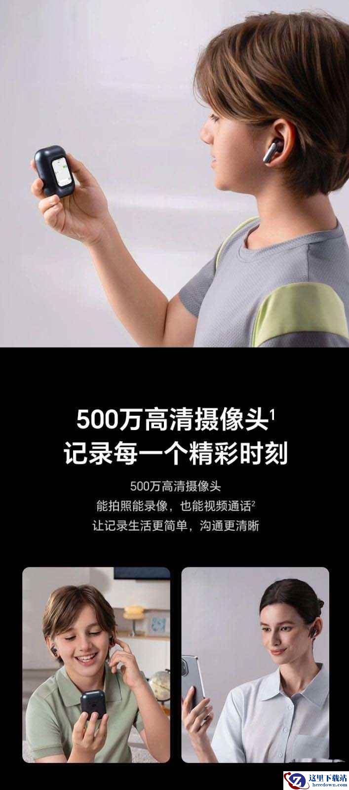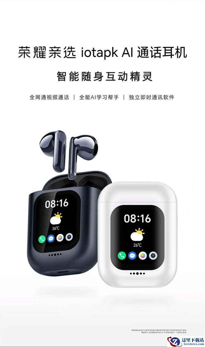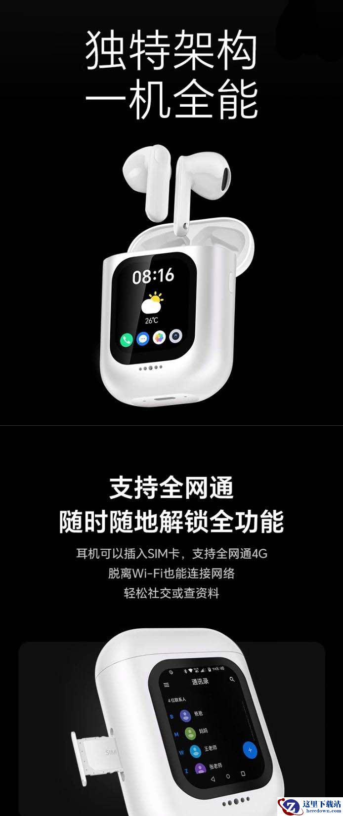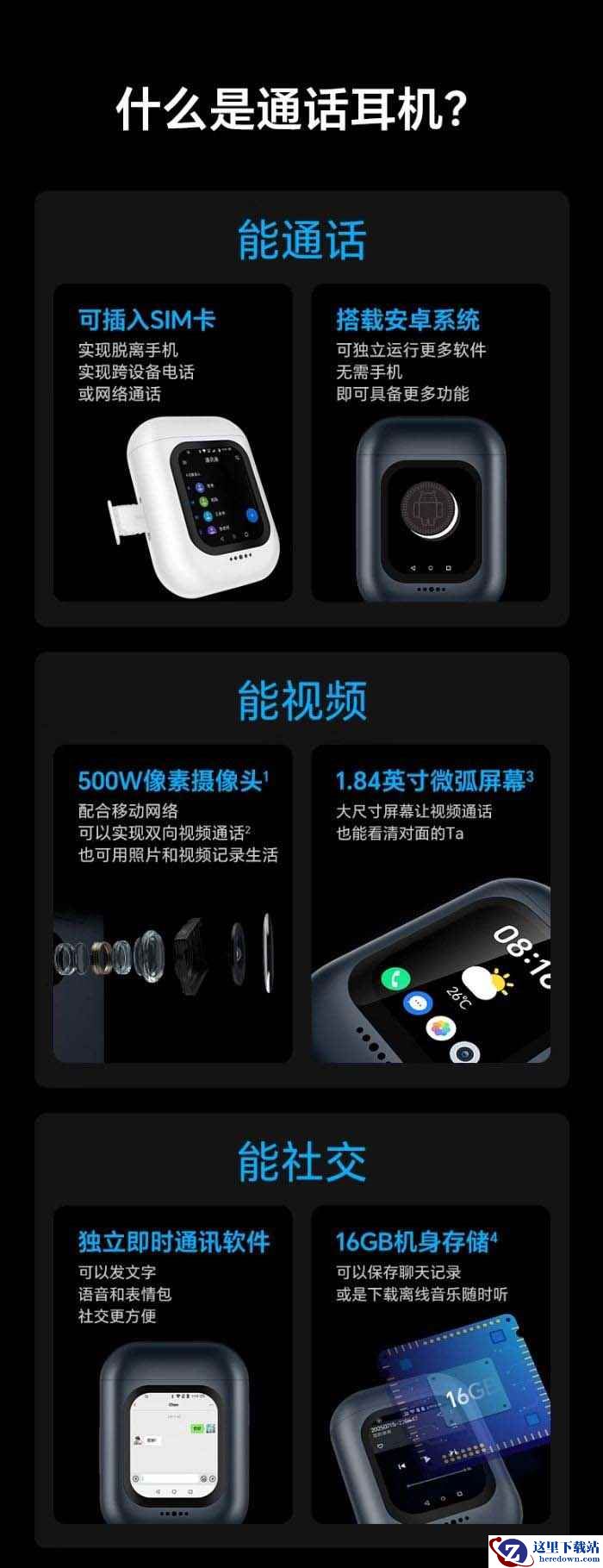 功能方面,这款耳机搭载安卓系统,可独立运行各种 App,内置 500 万像素摄像头,配合移动网络可实现双向视频通话,也可以拍照、录视频等,搭载 1.84 英寸微弧屏幕,支持独立运行“即时通讯软件”,配备 16GB 存储空间,可以下载音乐、存储聊天记录等。