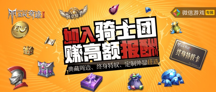 加入圆桌骑士团,组建自己的骑士队伍,通过邀请好友加入骑士团、分享活动、预约游戏及每日签到赚取报酬积分,兑换专属外显宝箱、典藏项链和终身福利卡等奖励!活动入口:微信公众号《全民奇迹2》底部菜单。