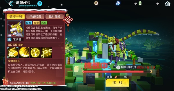 活动内容:活动期间网域将刷新虎王BOSS,每消耗一个爆竹可参与一次挑战,每次挑战结束后将根据伤害区间获得奖励~