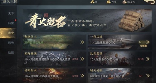 青史玩法,是《荣耀新三国》品鉴测试全新福利玩法。青史里面分为六大主题,当有玩家达到对应的要求以后,全服势力值在500以上的玩家就可以在青史中获取对应奖励。