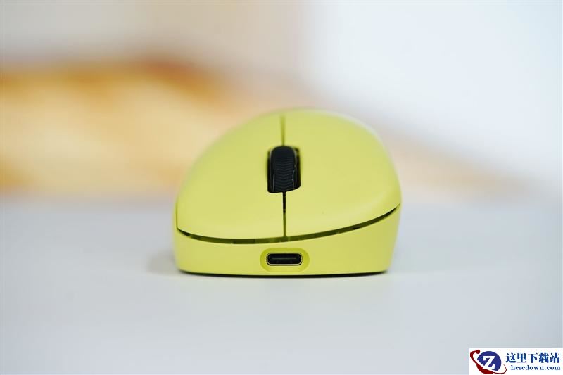 雷柏VT3s MAX前面可以清楚的看到针对右手的倾斜设计,用于充电和有线链接的USB Type-C接口位于鼠标正前方中央。