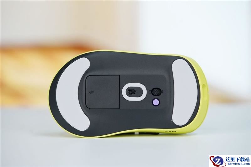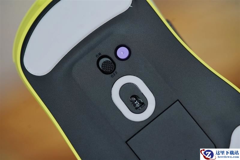 雷柏VT3s MAX鼠标底部设计十分简洁,两端贴有大面积的高分子脚贴,正中间是原相3950激光传感器窗口,环绕一圈O字形脚贴,避免异物进入遮挡传感器。电源开关旁边同样有一个紫色的DIY按钮,默认是回报率切换,用户也可以自己修改功能。