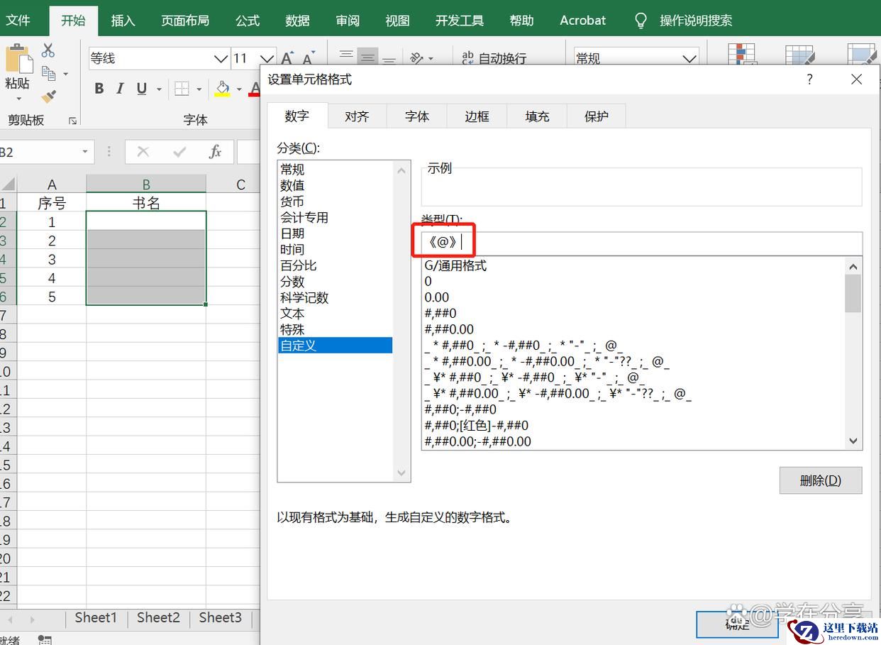 把之前的数据delete,然后选中书名的单元格区域,按Ctrl+1,打开设置单元格格式的对话框后,选择自定义。