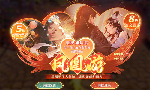 正值七夕佳期,全新「凤凰游」特惠活动开启,为你带来捏脸5折、巡游8折、亲密度加速三重好礼!一起换上情侣妆容与心仪之人月下相会,来一场盛大巡游“凤凰于飞”,每日前520点亲密度加成助力甜蜜约会!赶快与TA在神州浩土浪漫邂逅,欢度佳期吧~