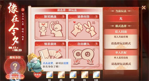 匿名速配,全凭真心!「缘在今夕」活动将于8月17日至8月23日每日18:00-23:30开启,在活动期间道友即可选择单人参与匹配,亦可邀请亲友同游,在七夕之际寻觅命定缘分!趣味身份,神州交友,用专属双人小游戏锚定你的意中人,找到彼此命中注定的那个“她/他”!