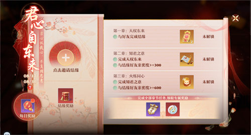 觅得知心好友,送上专属奖励!同性也可以参与的「君心自东来」双人任务将于8月17日12:00至8月30日开启,你将解锁丰富且趣味的解密玩法,让你和结缘之人有更多机会了解彼此!完成所有任务的道友,即可获得镌刻彼此姓名的称号,还能领取刻有TA名字的知心佩,在同一队伍中冒出专属特效大撒狗粮!