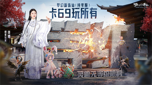 <69服>还有更多精彩待你解锁:单人玩法汇聚奇趣中心,随时畅玩!坐骑、仙灵、猫咪、仙府、师徒系统仍向你敞开怀抱,提升等级即可与之陆续相遇!全新瑰宝星空主题瑰宝热卖中,更将支持瑰宝跨服交易,让你变美更轻松!