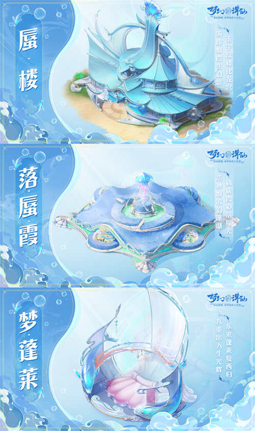 虽然灼热的夏日已经过去,但是一起在流波山沙滩踏浪的快乐值得被纪念,仙府再度上新海洋风格家具!海露烟霞生幻景,玉宇琼楼化龙宫,全新仙府主建筑「蜃楼」上线,从飘渺仙界瞬移至浪漫海岛,体味别样风情~