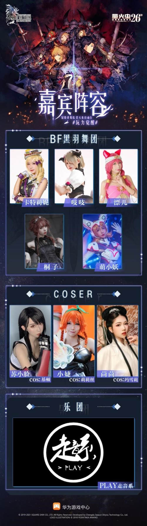 此外,《FFBE幻影战争》与华为游戏中心联合邀请众多嘉宾,在活动间隙安排宅舞和乐团演奏等精彩节目,欢迎各位冒险家前往活动现场观赏体验。
