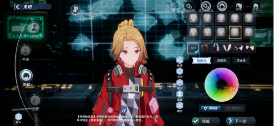 如果要用两个字来评价《幻塔》的捏脸系统,那就是“复杂”。从头发开始,《幻塔》的捏脸系统,几乎囊括了人脸部的每一处细节,每一块肌肉。以“发型”为例,一般游戏的捏脸系统,往往只把发型设计为一体,复杂一点的,会分出刘海和后发。但《幻塔》却把发型分为了“前发”、“中发”、“后发”三个独立的部位。每一个部位,都能选择不同样式进行自由组合。你可以选择“呆毛”配“高马尾”,也可以大咧咧地把额头和发际线露出来。此外,发型中的染发功能也十分齐全,像是挑染这种,完全没有任何问题。