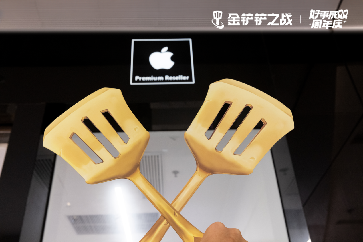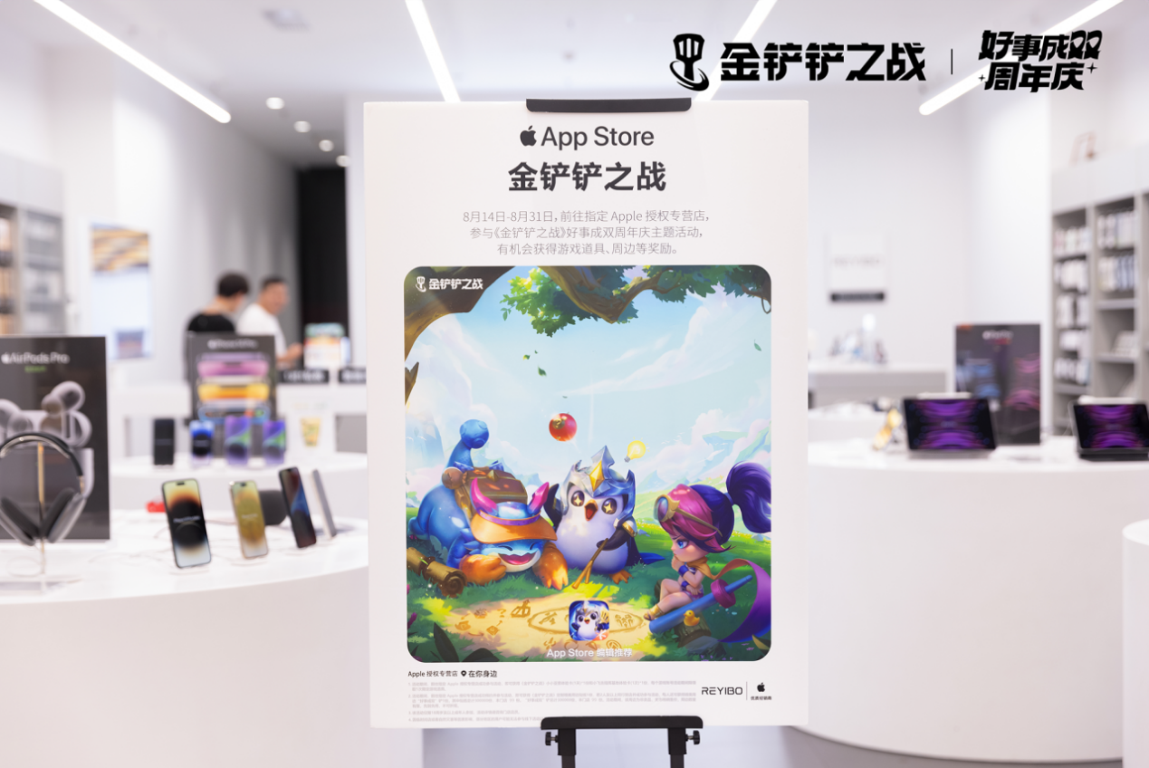 活动开始第一天,全国3000+ Apple 授权专营店就已竖起活动指引立牌静候各位弈士的光临,同时还为弈士们准备好了《金铲铲之战》周边贴纸以及“好事成双”铲等精美礼品。
