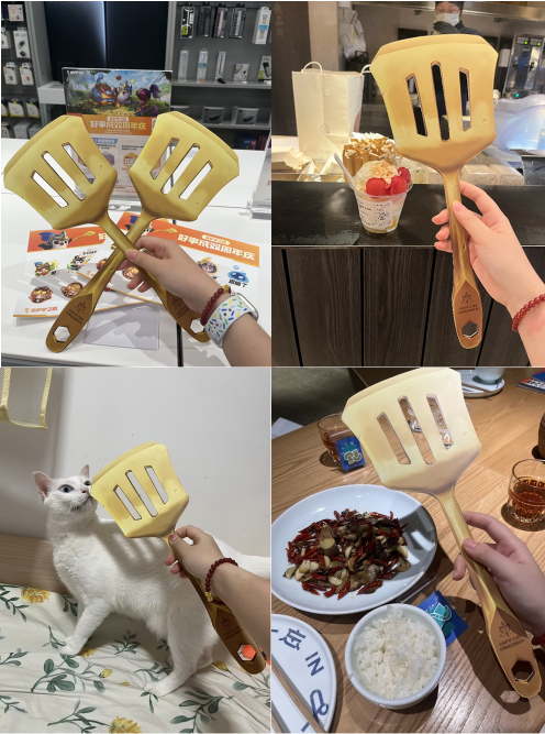 除此之外,当然还少不了重头戏——和自己的“好事成双”铲合照:“单排”的小哥哥顺利拿到“好事成双”铲后喜笑颜开,组队前来的小姐姐们手持“好事成双”铲的合影更是一道亮丽的风景线~