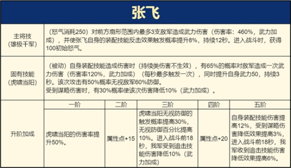 虎啸当阳在伤害之余可提升自身武力值50,并有50%概率无视敌军60%防御,极大提升了张飞后期的输出能力,该效果在张飞升至三阶后,更是能提升到80%概率无视70%防御。