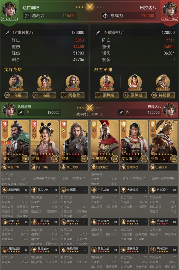 战报解读:在少了一个输出位的情况下,战斗时长增加了27秒,但战损方面相差不大;该版本张飞反击枪输出能力稍弱一线,但坦度持久战能力大大提高,在团战中的生存力也更强。