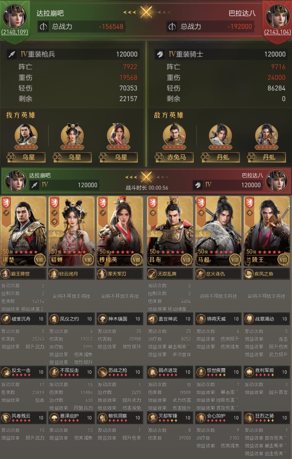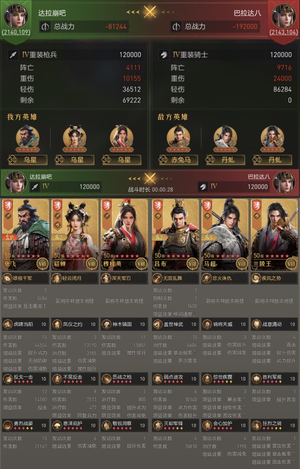 战报解读:无双骑是连击体系翘楚,该场战斗时长仅耗费28秒,张飞固有技能虎啸当阳触发了15次,触发间隔不到2秒!可见其在面对连击体系时的巨大优势。