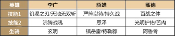 这个阵容已经有不少人推荐过,就不详说了,李广的输出已经得到大家的认可,貂蝉+熙德的副将组合给予了极强的坦度,团战冲锋无忧。貂蝉坐骑选择镇岳雷和特勒骠均可,由于严阵以待、持久战都是6秒回血,特勒骠的免伤持续时间也是6秒,所以正好全覆盖。
