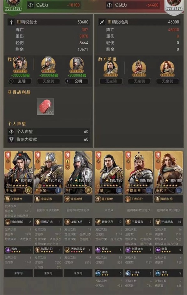通过这位玩家的测试可见,李广转剑搭配秦叔宝+李元霸,不论是主将位还是副将位,都有非常不错的表现。