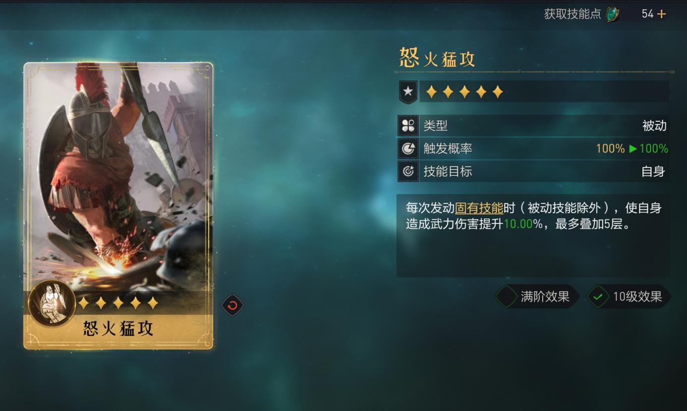 像是主将位列奥尼达,在装配了蛮勇侵袭的情况下,选择怒火猛攻能给包括主将技和固有技在内的三个输出技能增伤,叠满后每个技能提升50%,收益超过其他输出型技能。