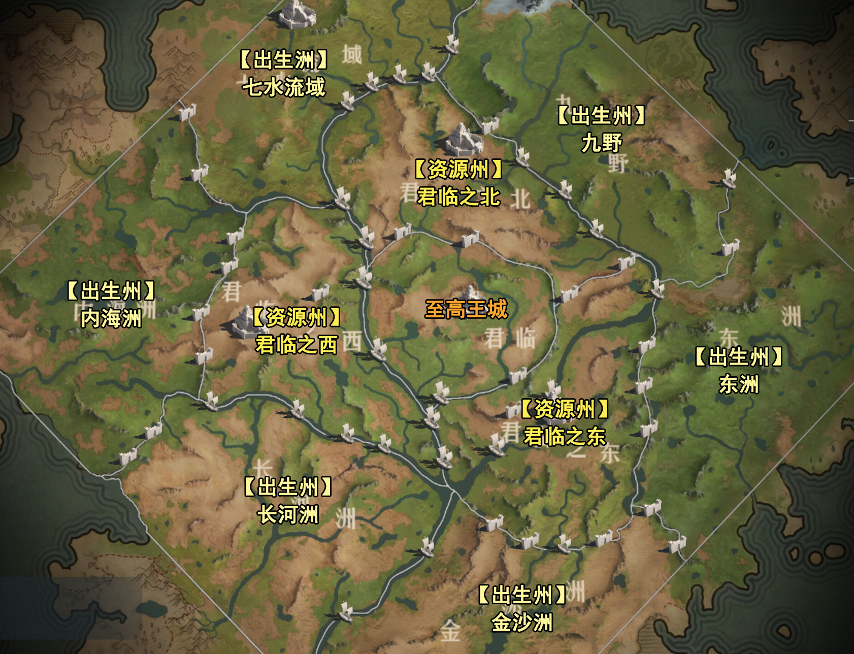 每个资源州拥有四个关口,这便是所有联盟争夺的第一个目标,抢占关口入驻三大资源州,获取更多的资源加速发展。而后通过六大关口(每个资源州存在两个关口)进军君临州,备战至高王城,争夺帝国大陆最高荣誉!