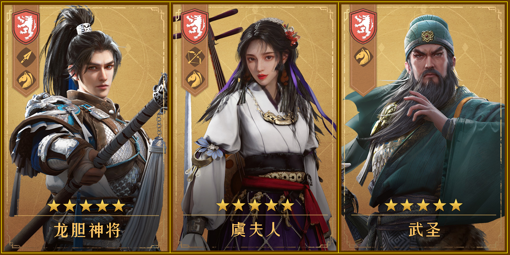 龙胆神将可通过基金领取,武圣和虞夫人可通过首充奖励获取,后期可用假面将军换下虞夫人,组成完全体连击骑。