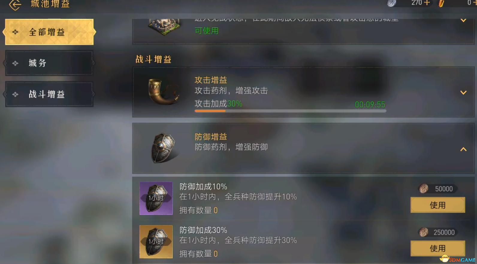 另外在发展过程中也可以使用buff增益来让自己获得更多优势,比如增加攻击或者防御,消耗铜币就可以激活,在新手期配合各种优待,能在很大程度上提升效率,当然,这些战斗增益不止在新手期有用,即使是在各种战斗场景,都能够发挥很大的作用。