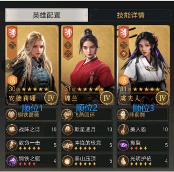 首先,阵容搭配的玩法跟传统SLG有一些区别,武将没有速度属性,靠主将-副将-副将的顺位依次发起攻击,谁先出手就非常好理解。搭配方式还是1主+2副将+技能组合。我开局免费领取了魏兰和安德莉娅,第二天就凑齐了一队“勇武弓”进行开荒。