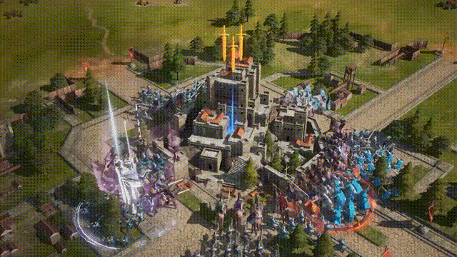再比如说更立体的城池设计,把攻城战从一件拉线打点的事情,细化成了一场真正对垒攻防:玩家可以用投石车、箭塔等攻城器械直接正面摧毁城墙,然后城内进行巷战缠斗,通过破坏功能性建筑,来增加攻打城镇中心的胜率。