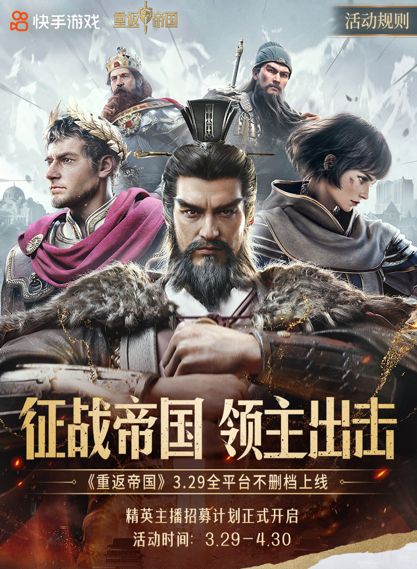 3月29日至4月30日活动期间,快手《重返帝国》精英主播招募计划正式开启,海量QB奖励,全面招募《重返帝国》主播及《重返帝国》视频、图文内容作品!