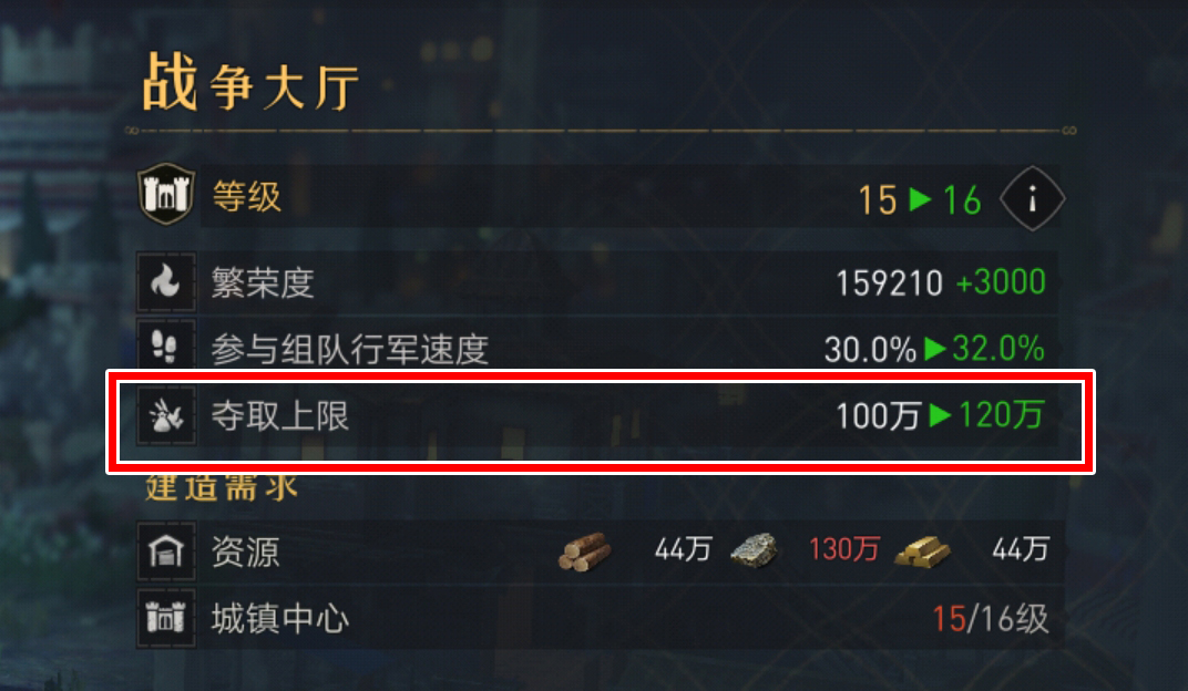 每日可掠夺的资源总量存在上限,基础30万,之后可通过升级战争大厅提升上限。