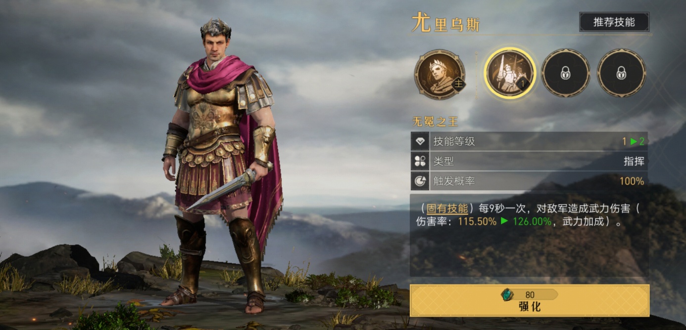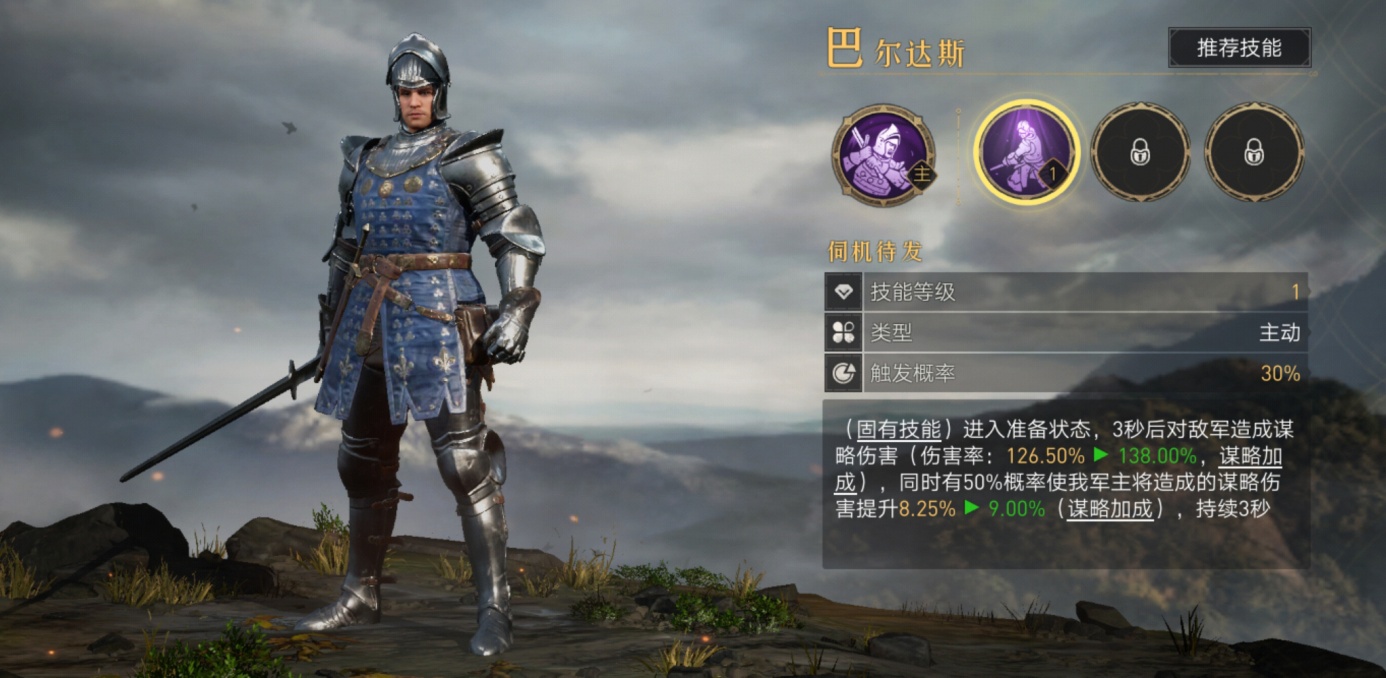 招募获取概率高,副将位,固有技能伺机待发在伤害之余可提升主将谋略伤害。