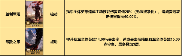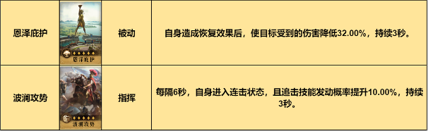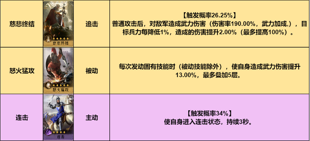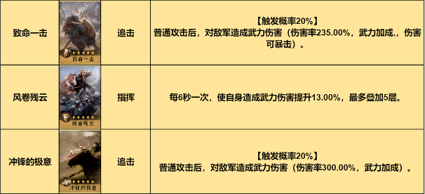 固有技能欺星逐月的伤害率有50%概率可升级为综合420%,爆发能力非常强,在有虞夫人辅助的情况下,另外两个技能可选择冲锋的极意和弱点进攻,如果战斗时间普遍较长,也可选择风卷残云。