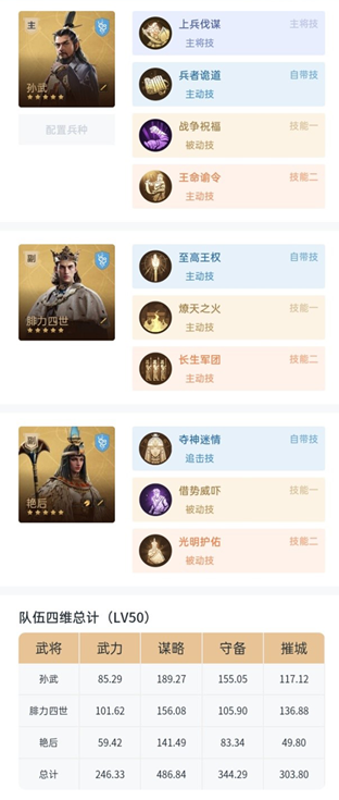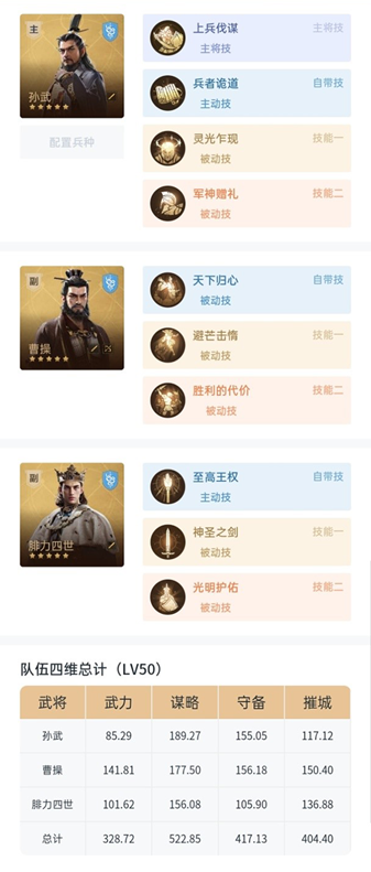 这是一套老牌强势阵容,曹操使孙武保持兵圣状态持续输出,菲利普提供一定的增伤效果。由于携带了胜利的代价,所以这是一套单核阵容,两个副将均不携带伤害型技能。