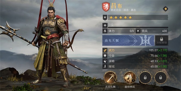 固有技能:盖世神武,提升自身暴击率,且使自身所有技能均可暴击;我军任意英雄暴击后概率增加吕布一次普攻,同时回复我军兵力。