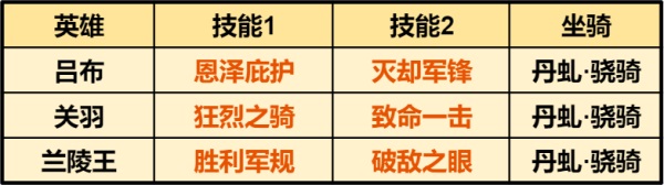 英雄阶级点数与无双骑相同,均为吕布和兰陵王一阶、关羽五阶。