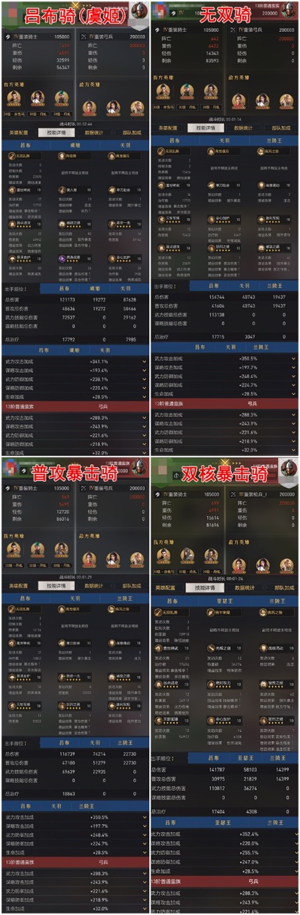 在对手同为小连击骑的情况下,普攻暴击骑战损比1:3.46,用时59秒;双核暴击骑战损比约1:5,用时38秒;无双骑战损比1:3.76,用时43秒;吕布骑(虞姬)战损比1:1.95,用时1分24秒。