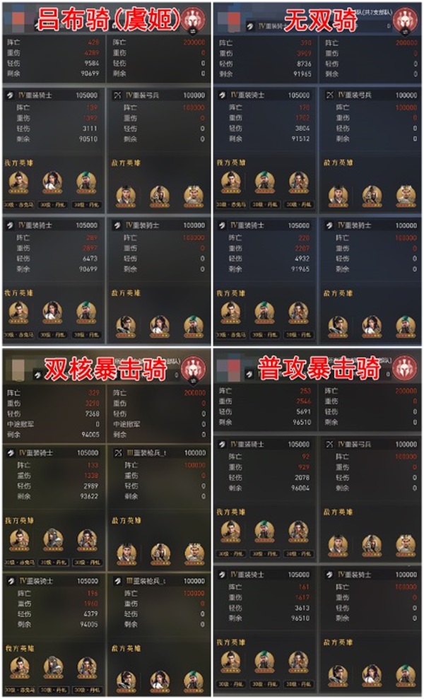 在同样击杀20万的情况下,普攻暴击骑伤亡0.85万,KD比23.56;双核暴击骑伤亡1.10w,KD比18.19;无双骑伤亡1.30w,KD比15.34;吕布骑(虞姬)伤亡1.43万,KD比13.99;小连击骑伤亡3.74w,KD比5.35。
