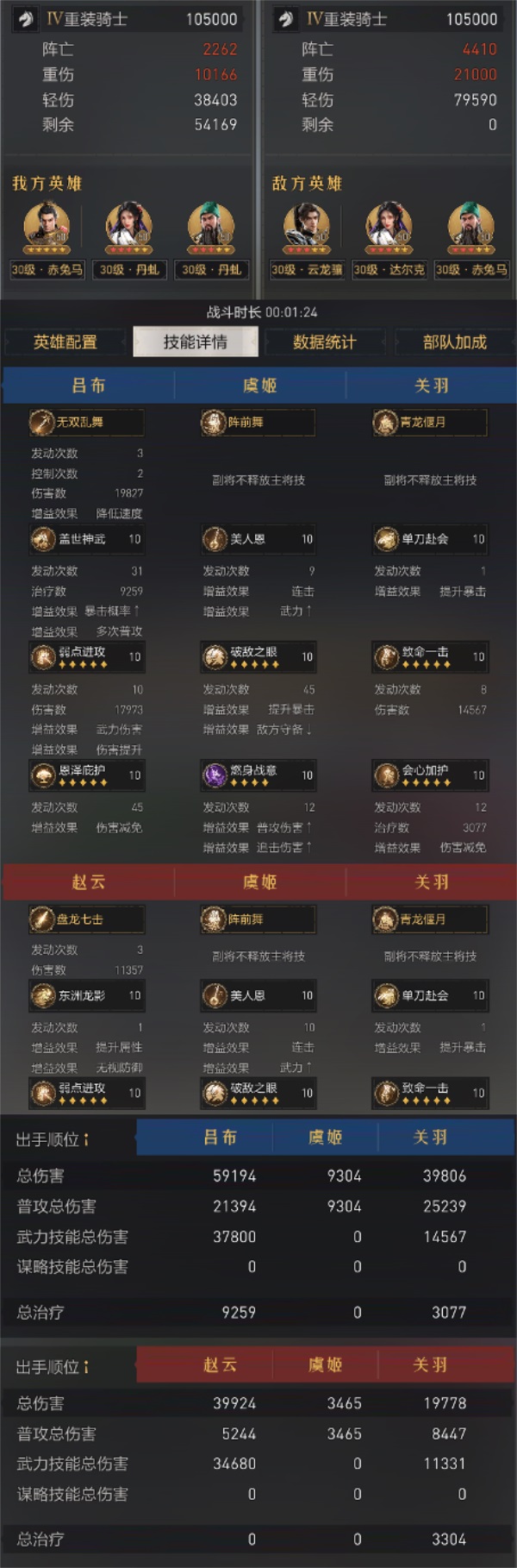 战报解读:战斗时长1分24秒,吕布骑(虞姬)阵亡2262,小连击骑阵亡4410,阵亡战损比约1:1.95。