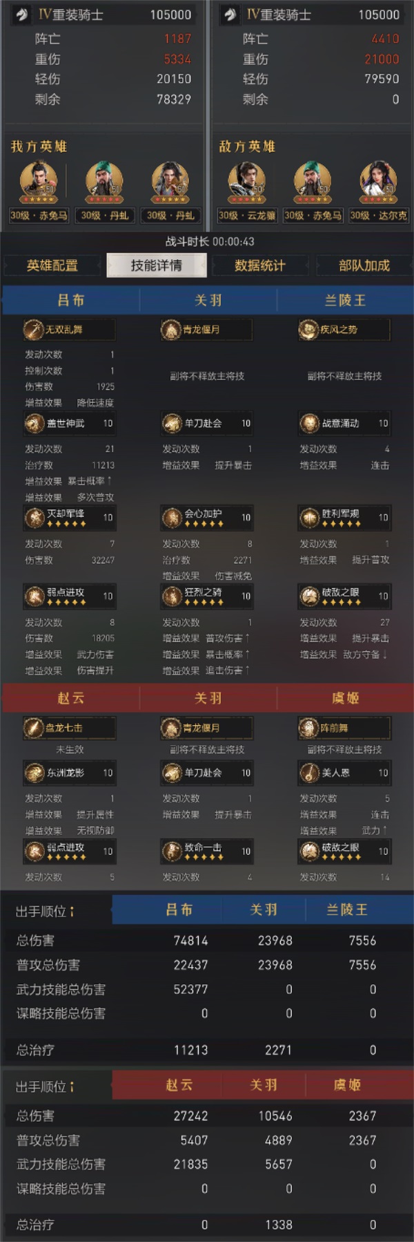 战报解读:战斗时长43秒,无双骑阵亡1187,小连击骑阵亡4410,阵亡战损比约1:3.76。