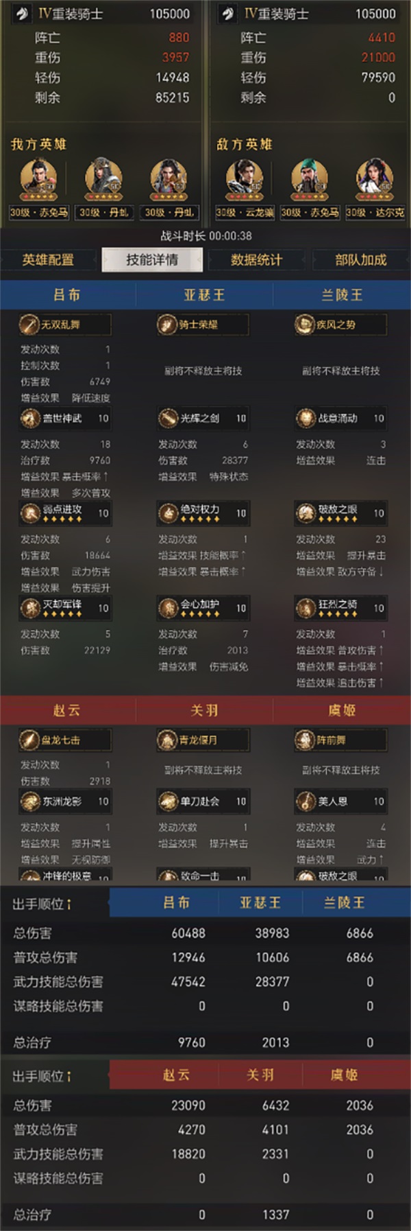 战报解读:战斗时长38秒,无双骑阵亡880,小连击骑阵亡4410,阵亡战损比约1:5。