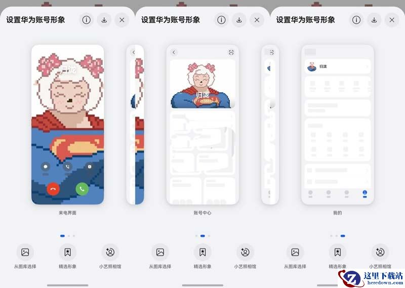 该功能与华为账号形象打通,设置后可直接对外展示,覆盖来电界面、账号中心、我的。用户可从图库选择自己喜爱的图片充当账号形象,也可以使用官方精选形象,同时还支持用户拍照后通过 AI 生成形象。