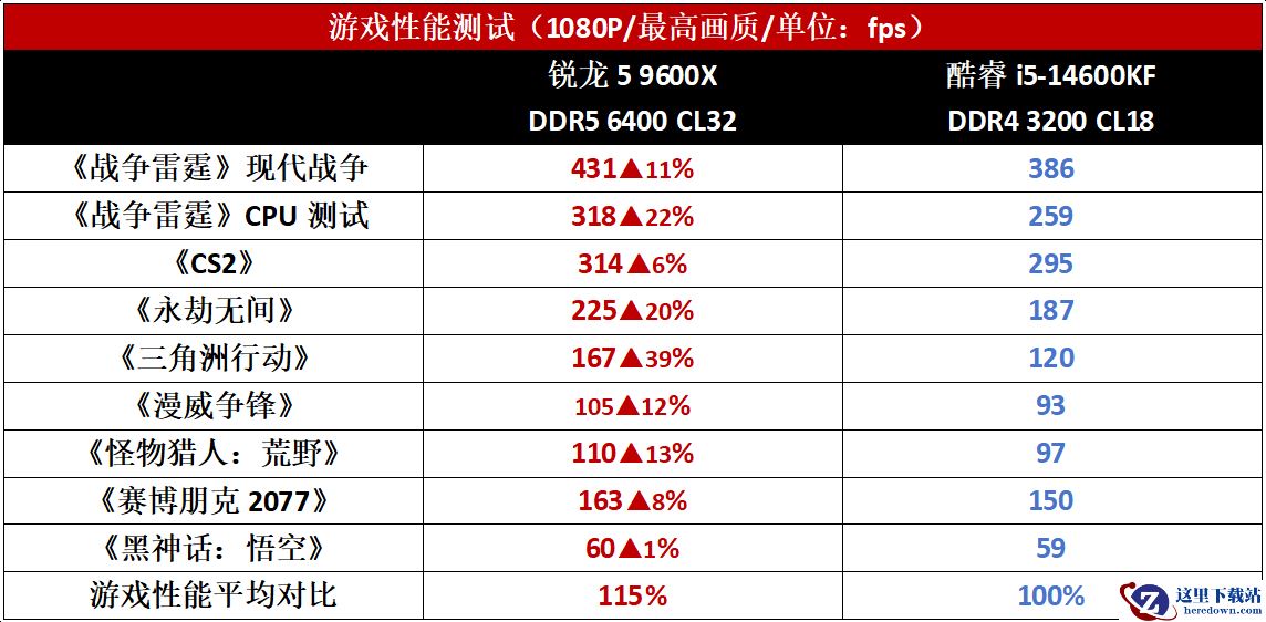 在实际的游戏测试中,显然内存高带宽比低延迟对平台游戏性能的影响更大,这在网络游戏中表现得最为明显。在《三角洲行动》中,锐龙5 9600X+DDR5平台获得了167fps的平均帧率,相较于酷睿i5-14600K+DDR4平台的120fps,领先幅度达到了39%。在《战争雷霆》CPU和《永劫无间》中,锐龙5 9600X+DDR5平台分别领先22%和20%,在《战争雷霆》现代战争、《CS》以及《漫威争锋》中,也有6%~12%的性能优势。综合所有测试项目,锐龙5 9600X+DDR5平台平均领先15%。