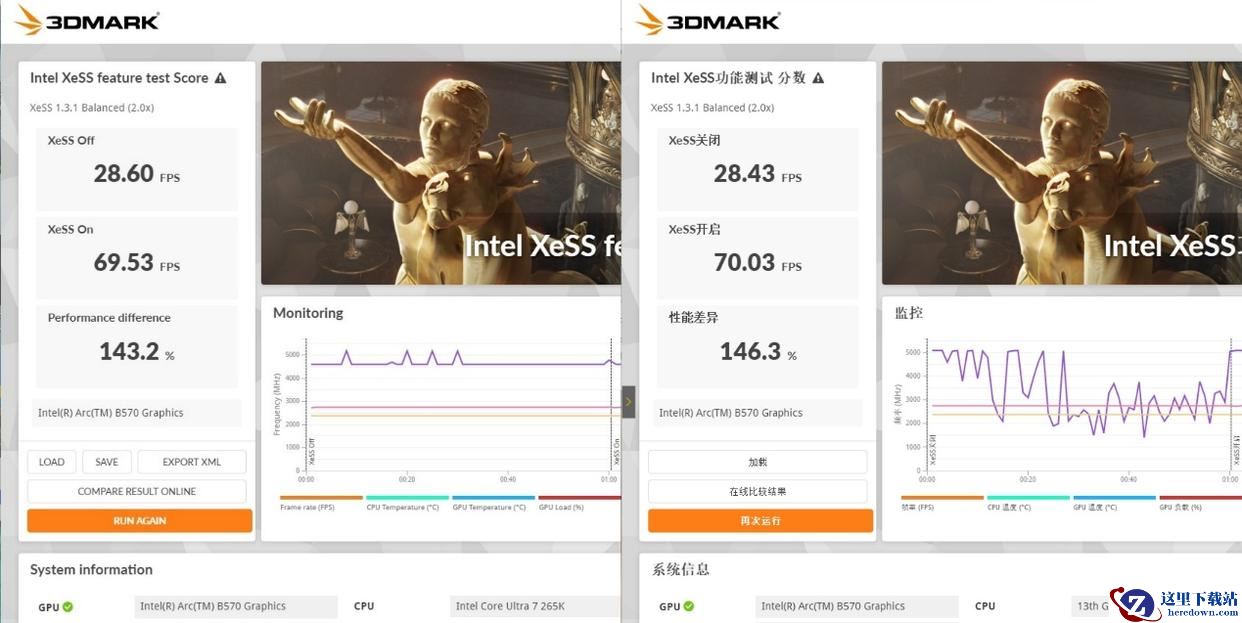 先来看看3DMARK软件下的测试结果,如无特殊说明,默认左图或上图为Z890D5平台测试结果,右图或是下图为B760MD4平台测试结果。蓝戟B570 Photon 10GB在3DMARK Xess 1.3.1 Ultra Performance (3.0x)下的测试结果如下,在Z890D5平台XeSS Off对应的结果为28.60 FPS,在B760MD4平台对应的结果为28.33 FPS;在Z890D5平台Xess On对应的结果为95.02 FPS,在B760MD4平台对应的结果为95.28 FPS。