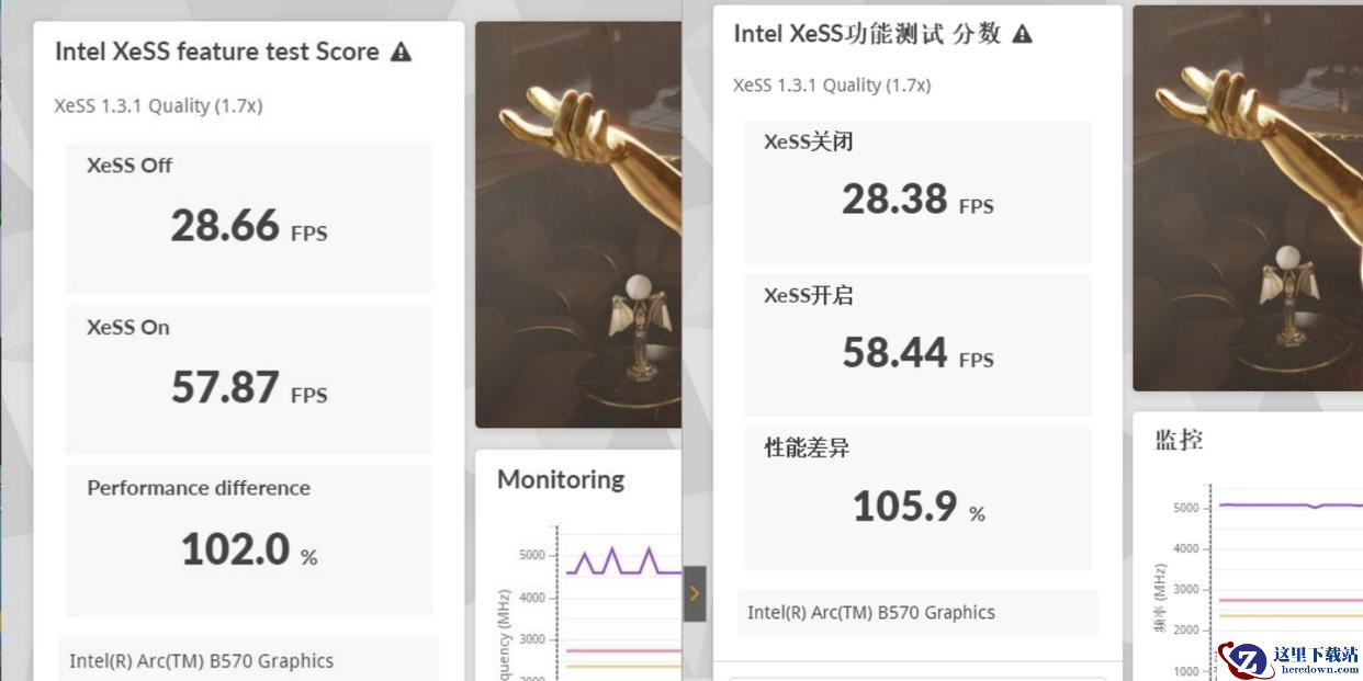 在Xess 1.3.1 Quality (1.7x)模式下,蓝戟B570 Photon 10GB在Z890D5平台 XeSS Off对应的结果为28.66 FPS, 在B760MD4平台对应的结果为28.38FPS;在Z890D5平台XeSS On对应的结果为57.87FPS,在B760MD4平台对应的结果为58.44FPS。